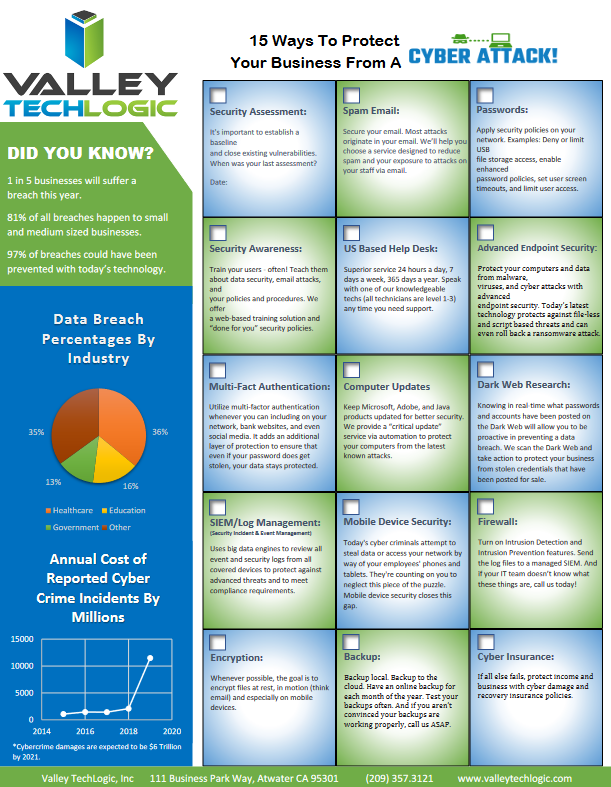 Implementing these 8 cybersecurity threat preventions will protect your business from most attacks, but if you’re looking to go a little further below are 4 cybersecurity benefits included with all Valley Techlogic service plans: