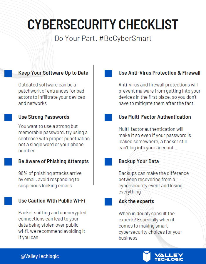 Many of the items listed are easy for even someone who’s not very tech savvy to tackle, but if you’d really like to protect your business from hackers this year, we suggest teaming up with a tech provider like Valley Techlogic.